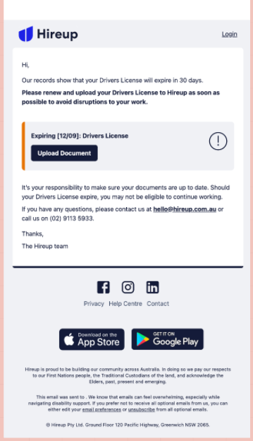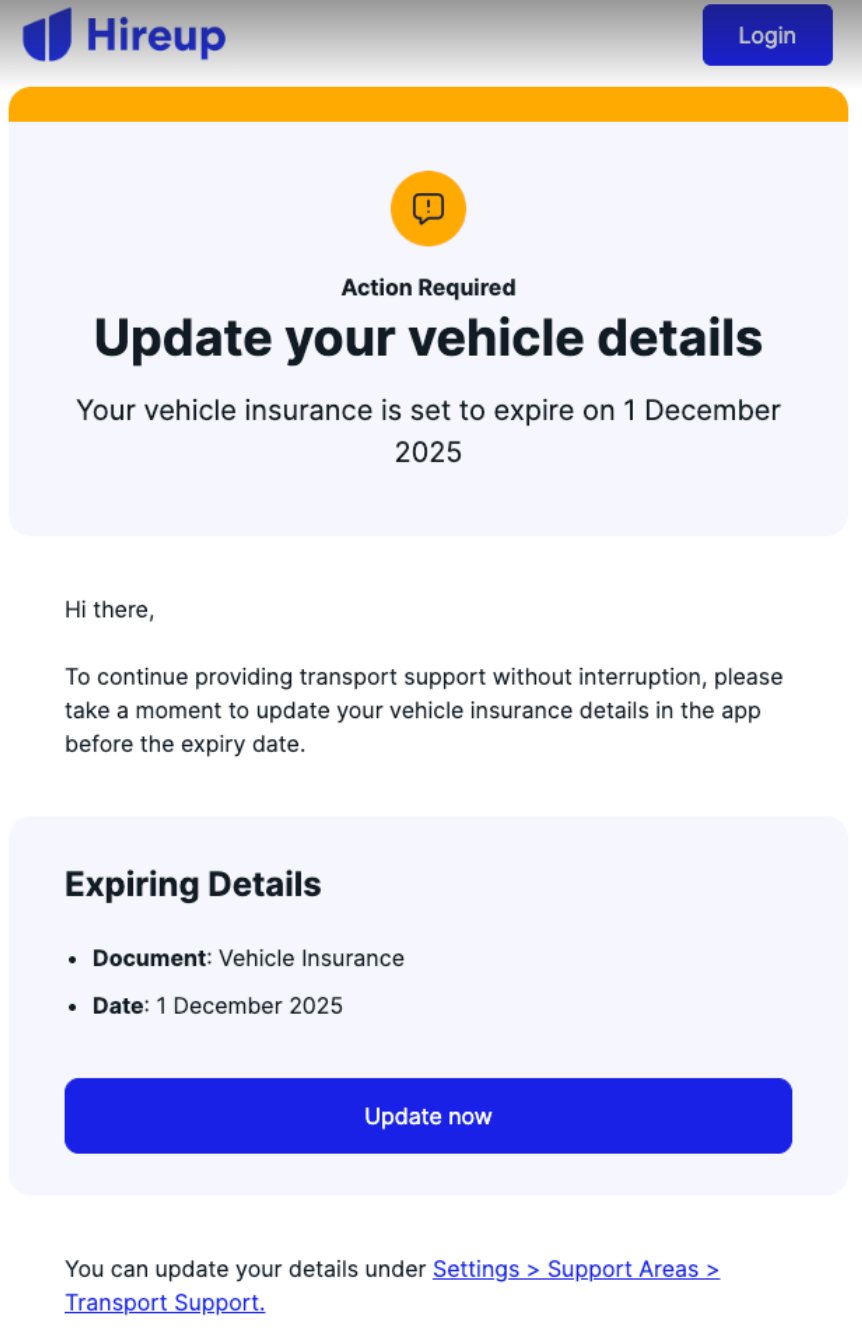 Notifications for an expiring Driver Licence and Police Check, will commence at 60 days, 30 days and 14 days before the document expires. If the document is not updated before the expiry date, your transport support will be disabled.