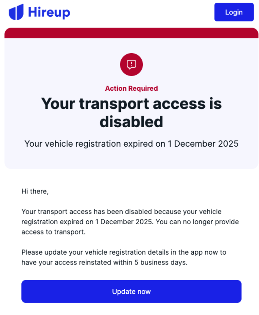 Hireup will receive an automated notification of your transport request. We will check and verify your documents and vehicle information and then enable transport support on your profile. This process can take up to five business days. |