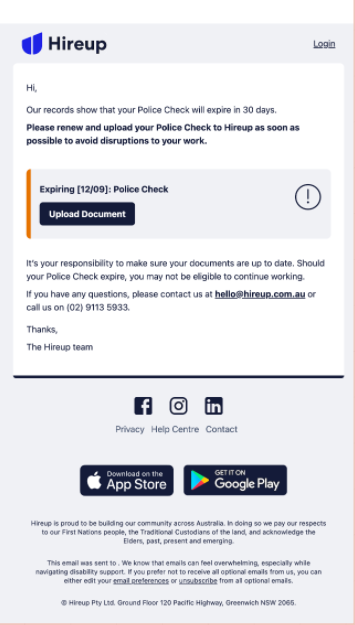 When you submit a new Police Check that contains disclosable outcomes, it must be reviewed and assessed for approval by Hireup before you can proceed to provide transport support. This process may take up to seven business days. You will be notified of the outcome to your registered email address on the platform. Reminder: You are not permitted to provide transport support until all documents have been verified and approved. |