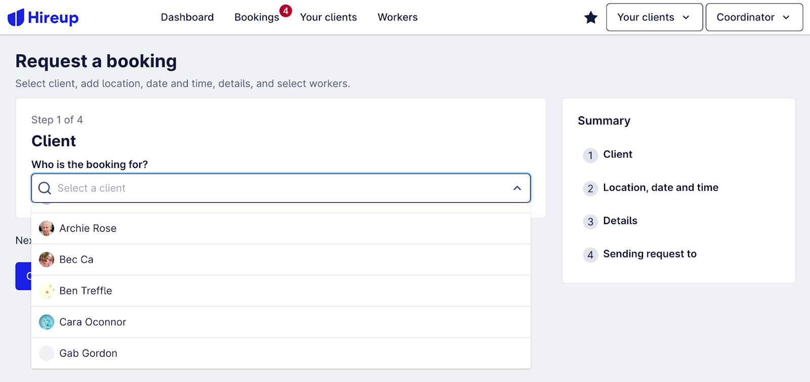 Before Booking Requests, Coordinators would have to log in as (or impersonate) their client to create a booking. This booking process could be time consuming: posting a job, messaging and shortlisting workers, then creating a booking with the selected worker.