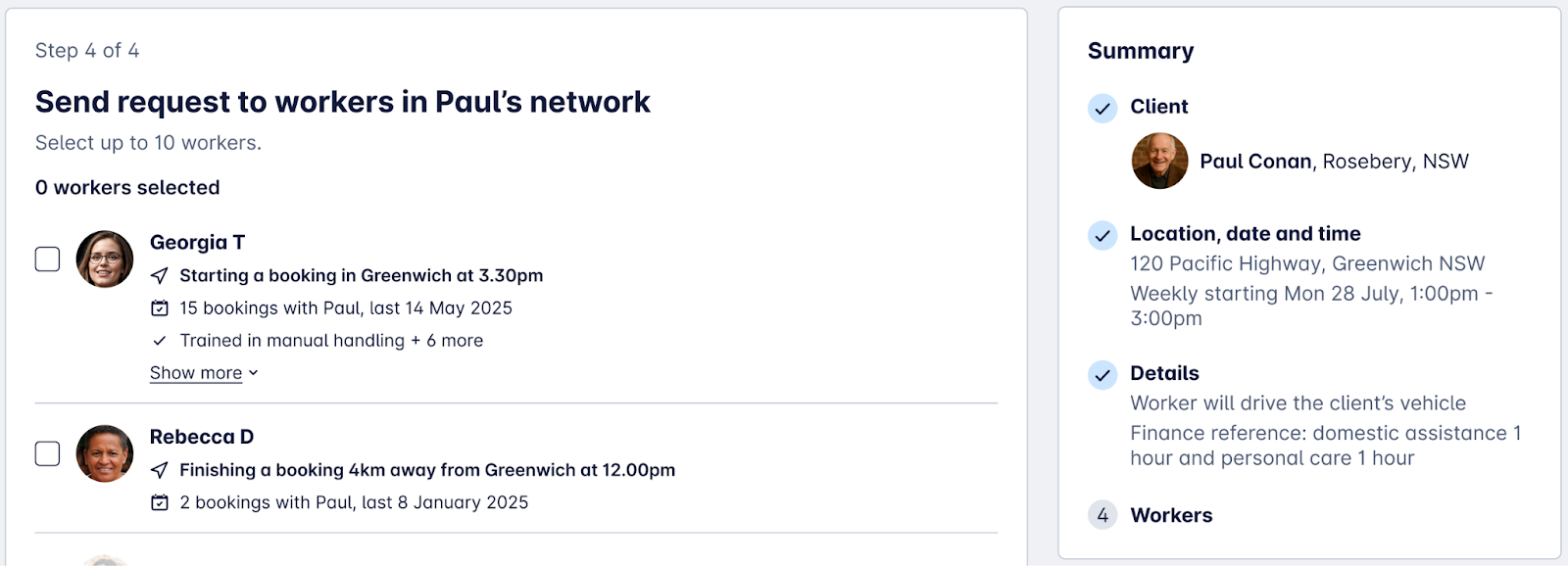 - Select up to 10 workers in your clients team, or workers from your own saved list, to send the booking request to